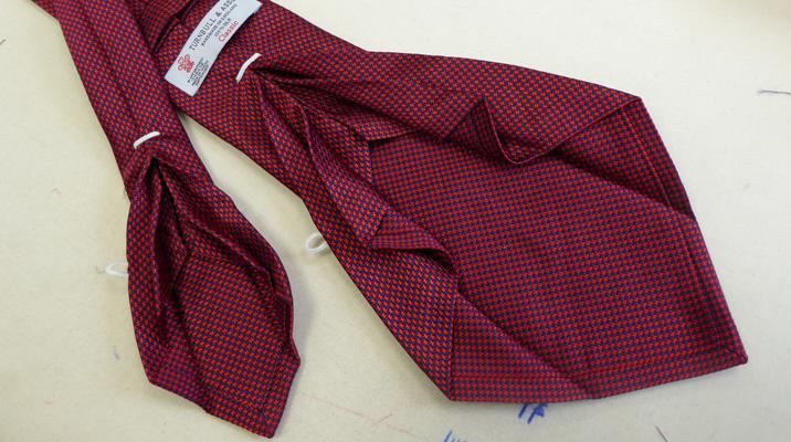 The long and laborious process of creating a seven-fold tie means every piece is a work of art in itself. Each creation is hand-made over three and a half hours by a dedicated seamstress using 0.77m of fabric – taking ten times longer and using double the material than that of a traditional tie, though the final width is the same 9.5cm measurement.