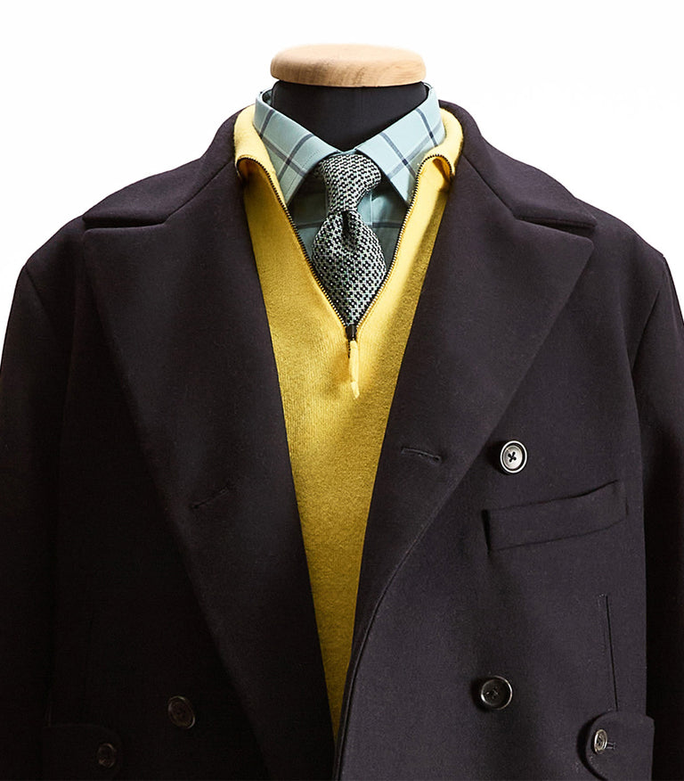 • A mannequin dressed in a navy blue coat, burgundy sweater, checkered dress shirt, and patterned bow tie against a plain background. Autumn/Winter Edit