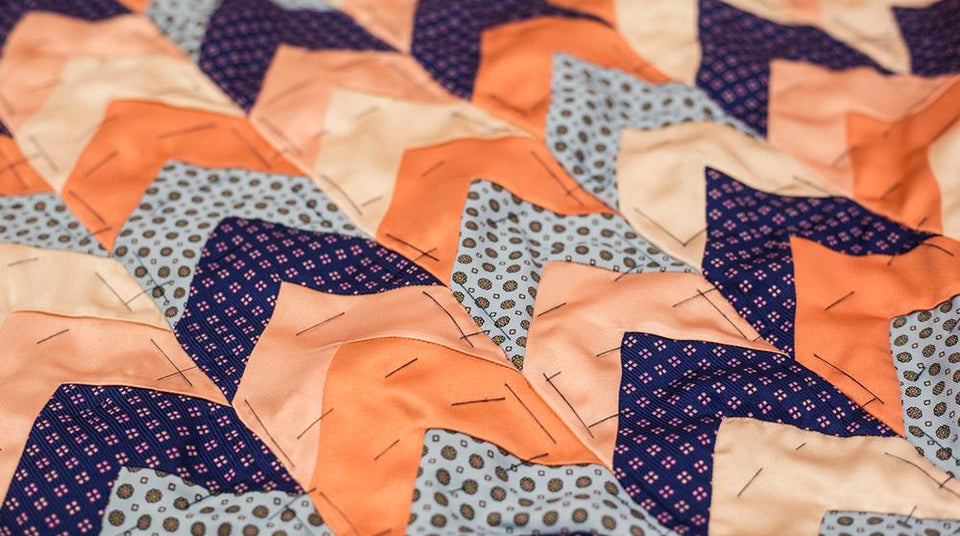 Around 330 individual pieces of cloth were used for each blanket, measured at 1m x 1.5m (approximately 11 pieces x 29-31 pieces). Taking ten days to make, the blankets were created by six craftspeople - four of whom focused on the hand-stitching and machining whilst two focused on cutting. The cloths include three satin silks, our Sky Blue Gatsby printed silk, and the Navy and Pink Mini Square woven silk fabric.