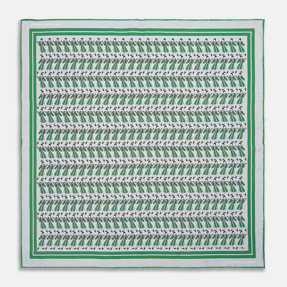 This exquisitely screen-printed silk pocket square is an excellent gift for the festive season. Its playful dressing gown design in green is inspired by the ornate silk gowns for which Turnbull is known.